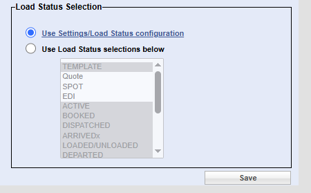 Click "Use Settings/Load Status configuration" to open a page to view and choose various Load Statuses for all customers.