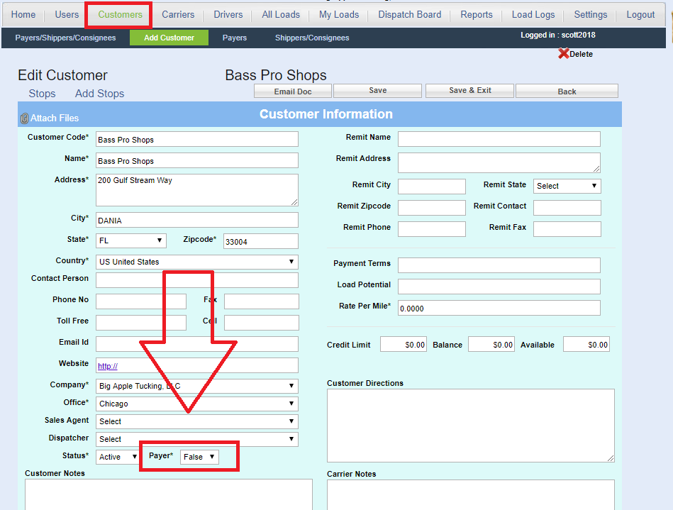 In order for a Customer to be considered a paying Customer, the "Payer" field must be true. If Payer = False, they are considered a Shipper/ Consignee. They will not appear in the Customer area of the Load screen unless Payer = True.